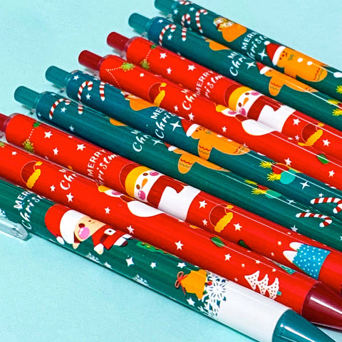 You will receive one fine line festive pen in your choice of design. They write in very fine black gel ink and have a click action.