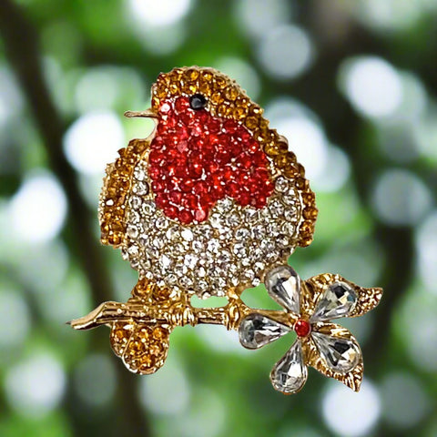 ROBIN Rhinestone Gold Tone Metal Festive BROOCH