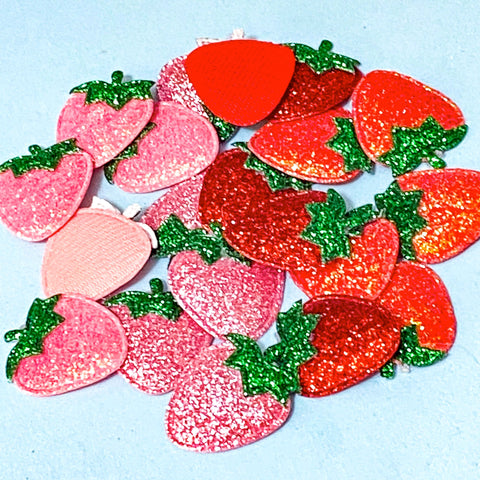 Each strawberry fabric patch measures 26mm tall and has a glittery or aurora borealis (AB) finish. The reverse is plain. You will receive one patch. The patch must be sewn or glued on.