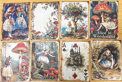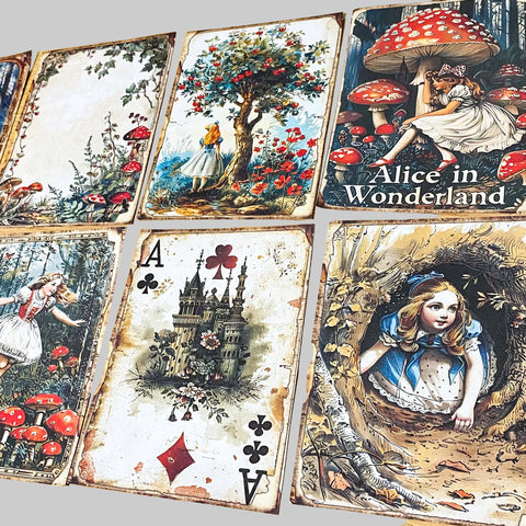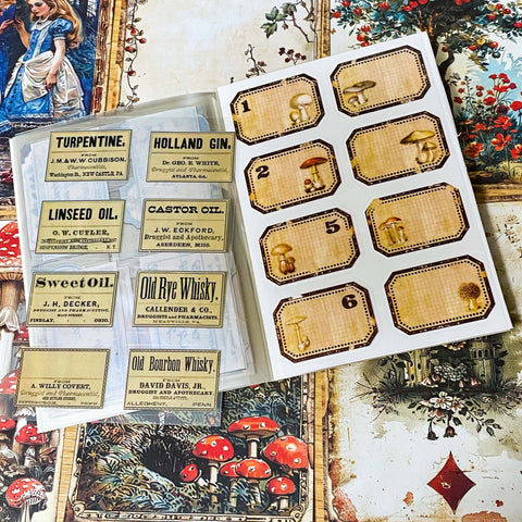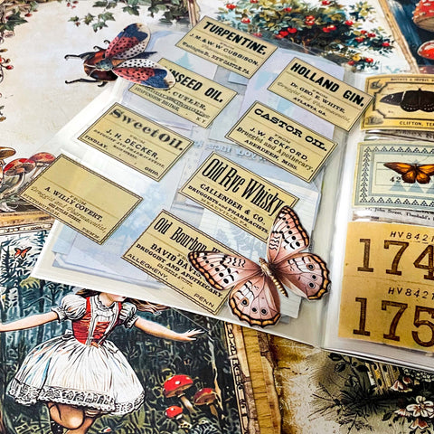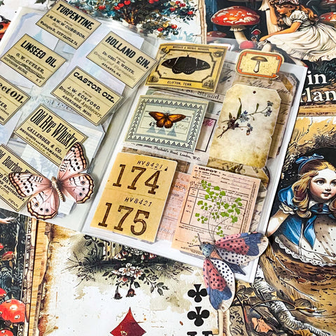 Alice in Wonderland Junk Journal Kit- 8 Vintage Botanical Scrapbook Set, Labels, Ephemera & Clear Stickers