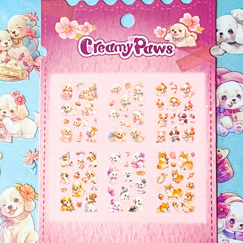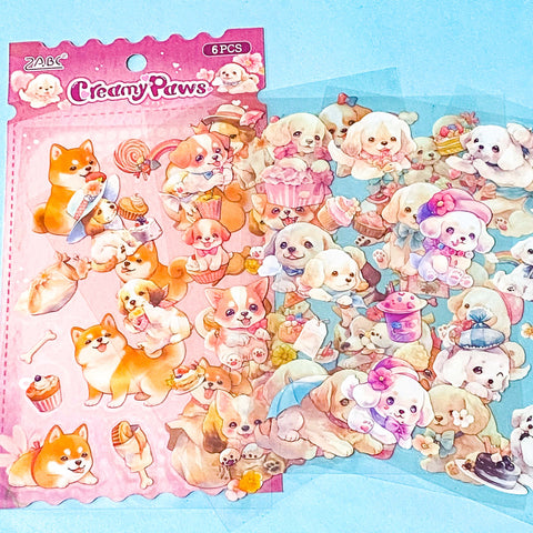 This adorable clear plastic sticker set includes 6 beautifully illustrated sheets filled with cute puppy characters, desserts, flowers and playful scenes.