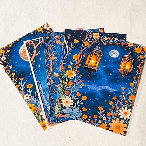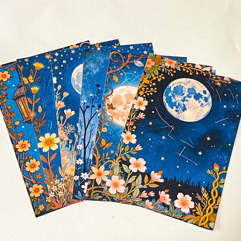 This set of illustrated art papers features rich blue tones and warm botanical details, perfect for journaling, collage and creative projects.