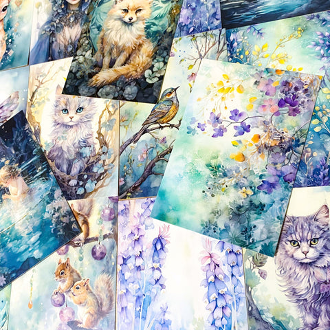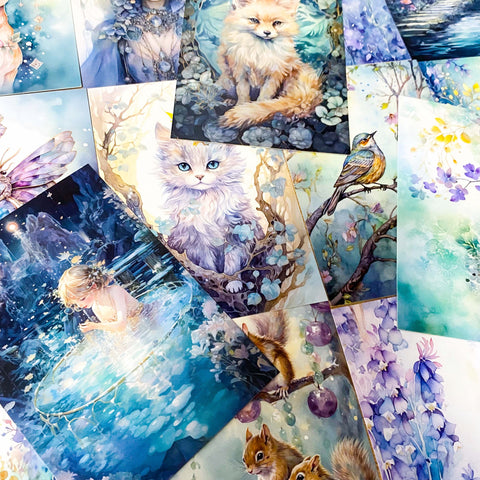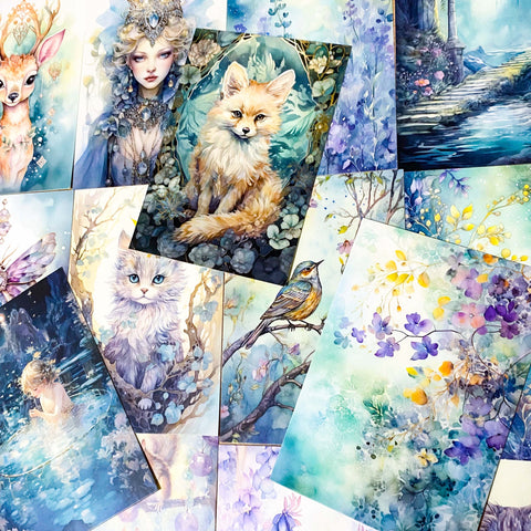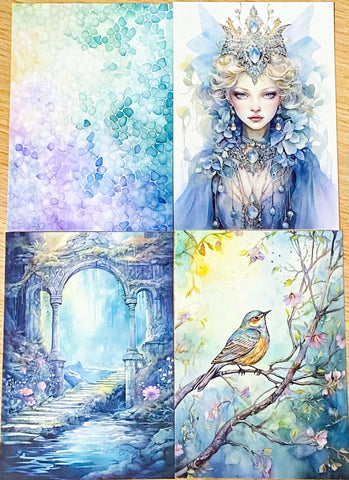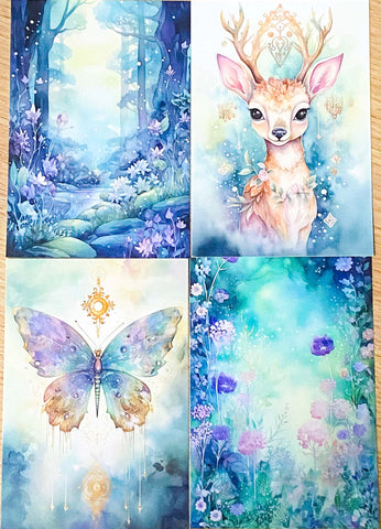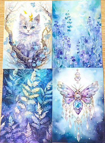 You will receive one bundle of 4 turquoise and lilac fantasy themed postcards. The reverse is blank. The cards measure 144mm by 100mm.