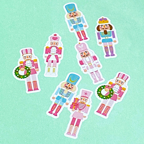 The nutcracker stickers measure 30mm tall. You will receive 22 of them. All are peel off die cut stickers with a glossy finish and white edges.