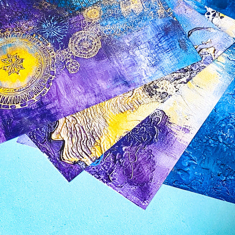 • Papers feature textured, painterly designs in deep blues, purples & gold tones