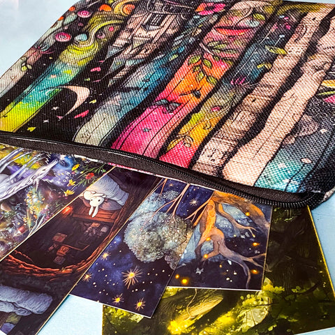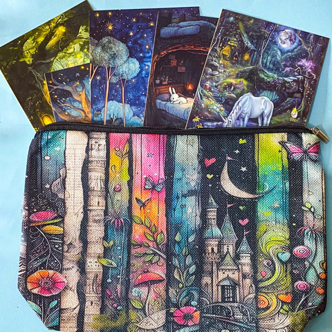 The large canvas pouch features a beautifully illustrated bookshelf design with fairytale details, paired with a curated set of dreamy illustrated postcards inspired by enchanted forests and storybook scenes.