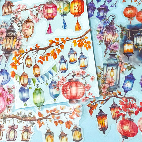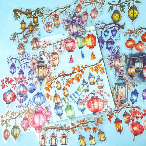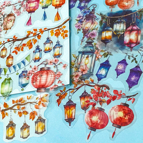 These large decorative stickers are printed on clear material so the lanterns appear to float beautifully on journals, planners, scrapbooks and craft projects. The artwork has a soft watercolour style with warm glowing lights, colourful lanterns and delicate botanical details.