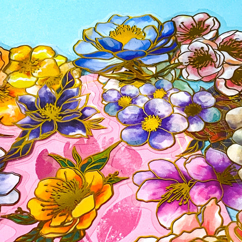 A lavish collection of oversized botanical blooms, each delicately traced in shimmering gold foil.