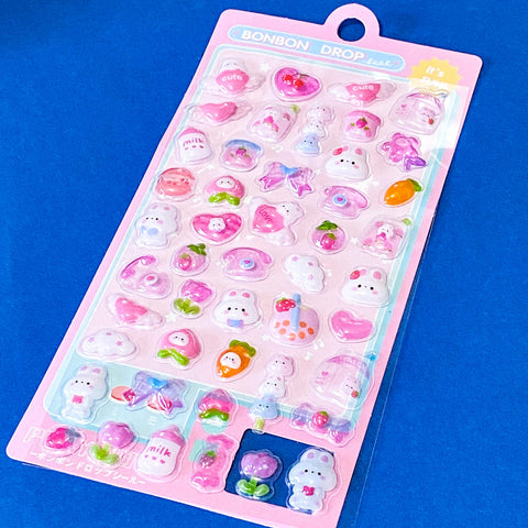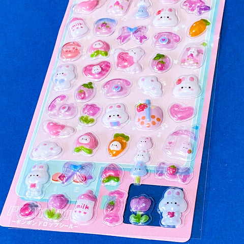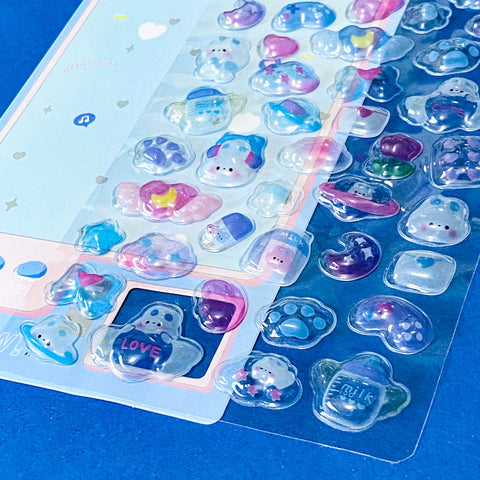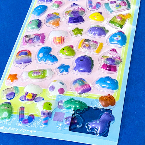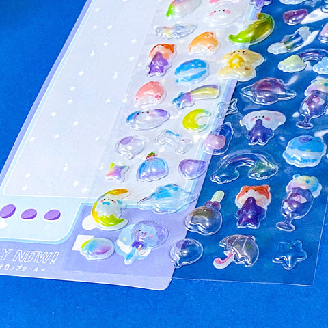 Each sheet features tiny pastel characters, sweets and dreamy shapes such as bears, bunnies, moons, stars, clouds and candy. The stickers are made from rigid glossy plastic with a raised dome finish, giving them a shiny dimensional look that stands out beautifully on paper.