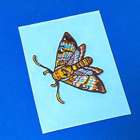 This detailed iron-on appliqué features a dark brown, turquoise, teal, mustard and black moth.